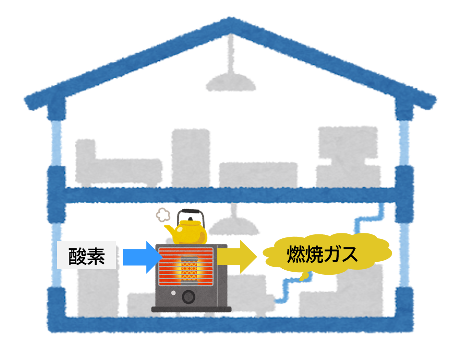 石油ストーブを換気なしで長時間使ってしまうと、室内の酸素が消費され、有害な燃焼ガスがどんどん室内に貯まってしまいます。