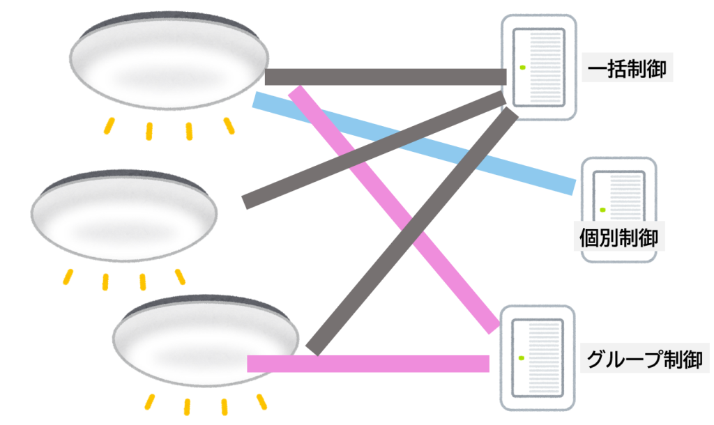 1つのスイッチでたくさんの器具を入切したり、一つの器具を複数スイッチで入切したり。